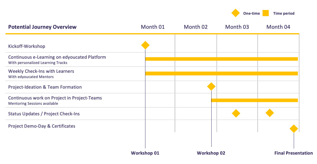 Praxisorientierte Gruppenprojekte bilden einen besonders wichtigen Teil der zweiten Hälfte der Lernprogramme: Die Lernenden wenden ihre neu erlernten Skills in Datenprojekten an, die oft einen direkten Bezug zu ihrem Arbeitsalltag haben, und festigen so unmittelbar ihr Wissen und schaffen Wirkung am Arbeitsplatz. Ein häufig gewähltes Projekt ist das automatisierte Dashboard, das die täglichen Überwachungs- und Berichtsprozesse erleichtert, aber auch Ideen des maschinellen Lernens wurden erfolgreich umgesetzt.